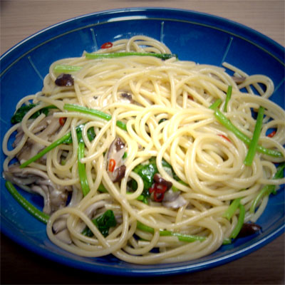 写真は水菜と舞茸のペペロンチーノです